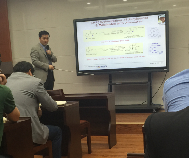 2016516日下午,受黄色电影 邀请,新加坡国立大学卢一新教授就基于氨基酸的双功能磷催化剂在对映选择性反应中的应用做了精彩的英文报告,报告由黄色电影 副院长吴磊教授主持。黄色电影 院长章维华教授、化学系主任兰叶青教授、副主任陈道文副教授、吴华教授、部分青年教师及化学系研究生参加了本次学术活动。