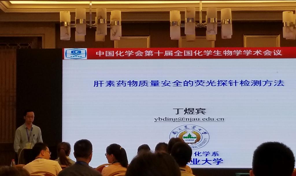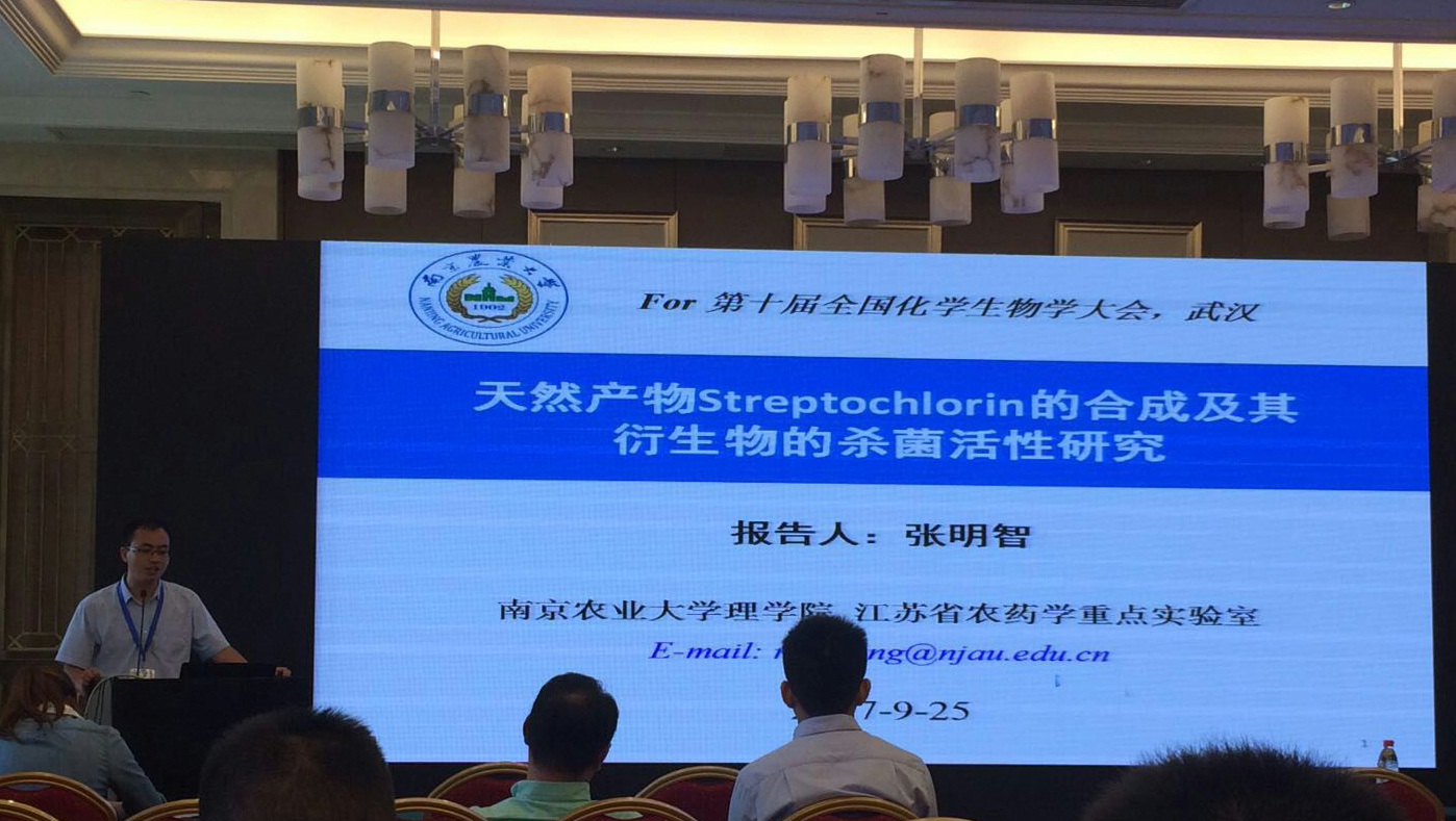 会上,课题组丁煜宾和张明智两位老师在农业化学生物学分会场分别做了“肝素药物质量安全的荧光探针检测方法”和“天然产物Streptochlorin 的合成及其衍生物的杀菌活性研究”的口头报告。