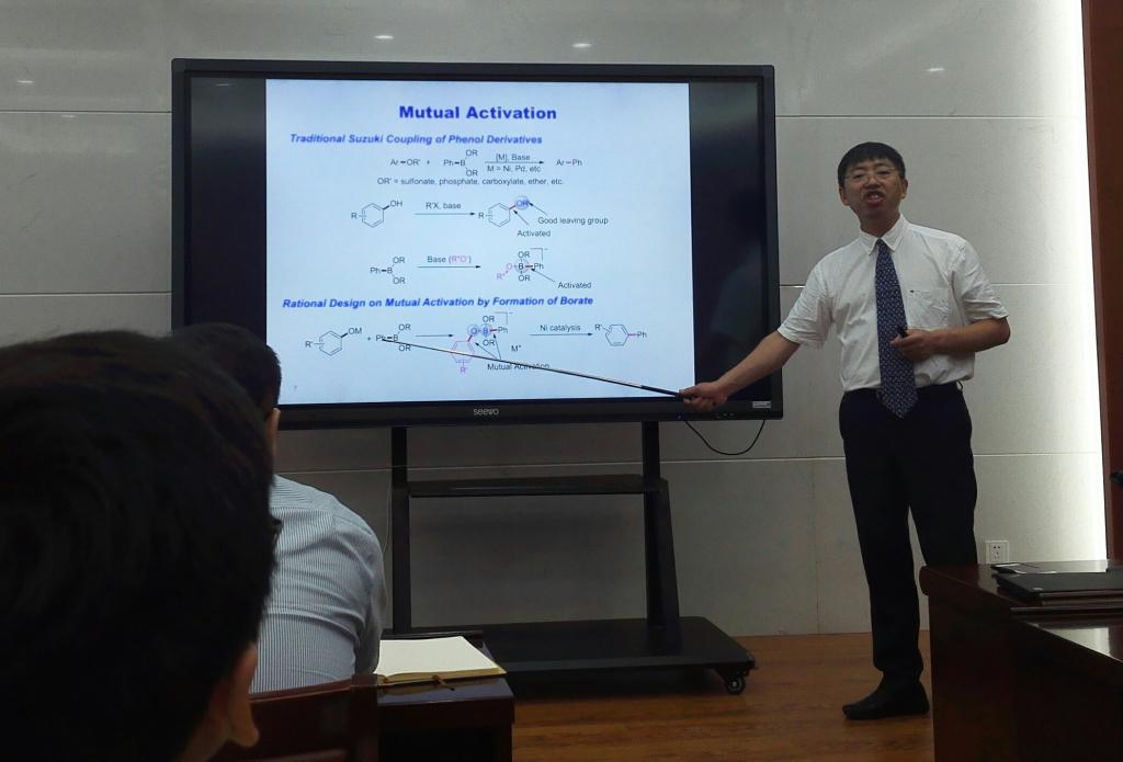 报告会上,施章杰教授深入浅出,从基础有机化学的角度出发,引出现有C-C键偶联方法所存在的问题,进而介绍了本课题组在碳氧键等惰性化学键活化等方面的研究进展。报告中,施教授不但介绍了其课题组的科研成果,也向与会师生分享了从事科学研究的感悟,鼓励同学们要不畏艰难、相互合作、从科研过程中锻炼、提升自己。报告会现场气氛轻松而热烈,与会师生就感兴趣的内容同施章杰教授进行了热烈的交流和讨论。