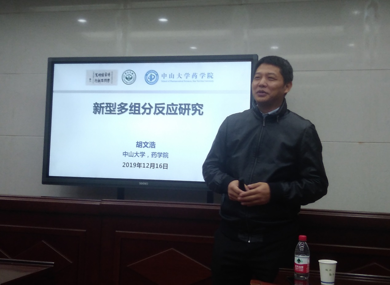 胡文浩教授的报告题目为“新型多组分反应研究”。多组分反应(multi-component reaction 或 MCR)是指三种或更多种化合物发生反应形成单一产物的过程。 根据定义,两种以上的反应物按照一定的次序相结合,其中起始物料中大部分原子得到保留,是高效制备结构多样性化合物的有效策略。胡文浩教授系统介绍了其团队基于捕捉活性叶立德中间体和协同催化策略的新型多组分反应研究。胡教授与现场师生进行热烈的互动,详细而耐心地回答了师生们提出的问题。
