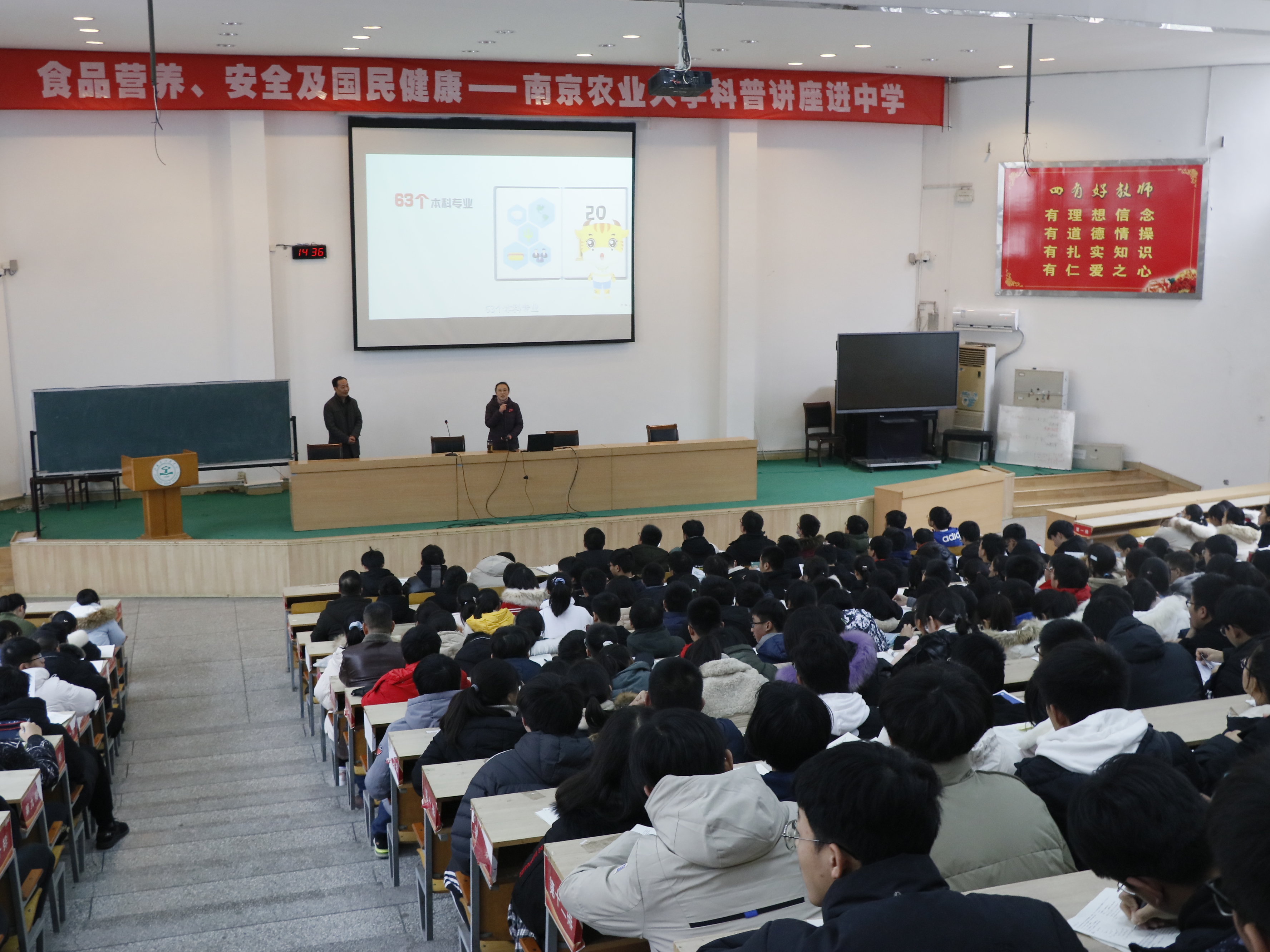 下午14:30,江苏省江都中学报名厅座无虚席。报告开始前,通过《楠小秾的选择》短视频为江都中学的同学们介绍了我校的基本情况,并鼓励同学努力学习,欢迎同学们选择南农。随后食品科技学院韩永斌教授为该校全学生带来主题为“食品营养、安全和国民健康”的精彩科普讲座。韩教授的讲座深入浅出,生动有趣,让同学们在趣味知识中了解食品科学,播种兴趣的种子。