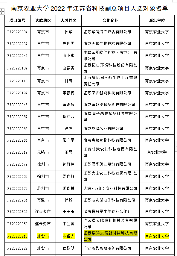 近日,省委人才办、省科技厅印发了《关于确定2022年江苏省科技副总项目入选对象的通知》,黄色电影 张曙光老师与合作企业江苏瑞洋安泰新材料科技有限公司联合申报的科技副总项目入选。