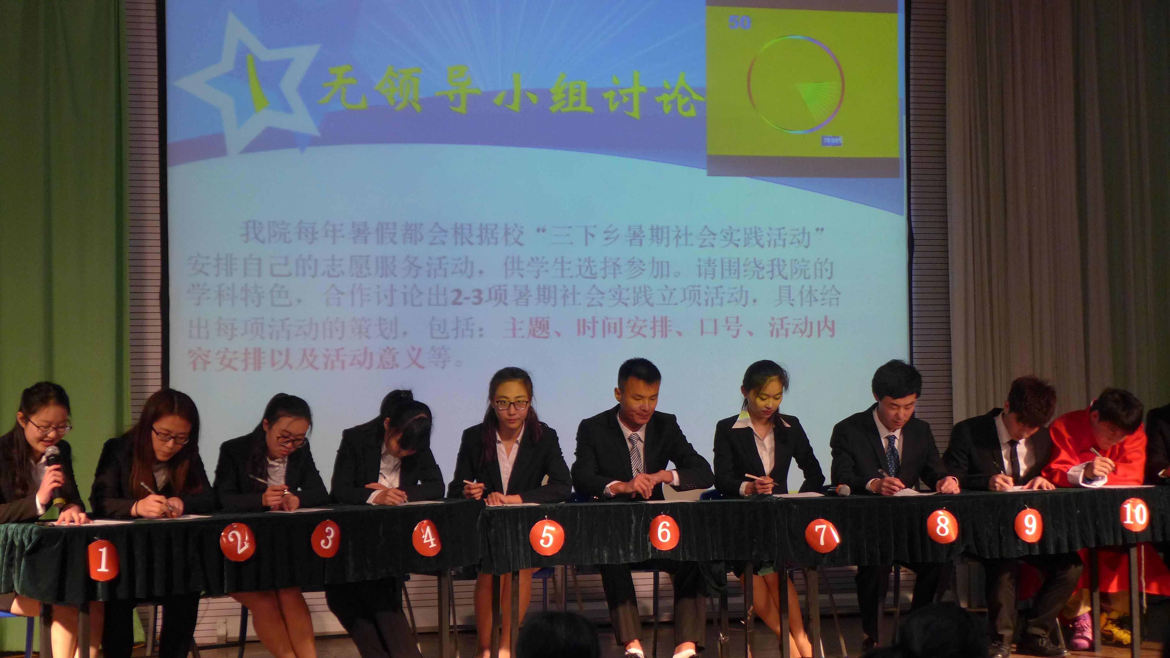 无领导小组讨论后,同学们投出的选票也被收集统计。统计过程中,由下班党员赵书平同学对学生会的各工作部门做出了相应的说明,也提出了未来的发展期望。参赛选手也为老师和同学们献上了自己精心准备的节目,为大家带来享受与欢乐。