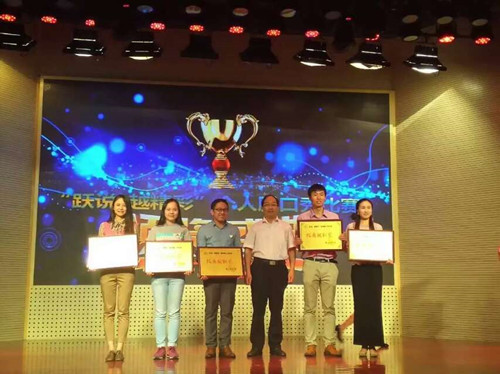 辅导员朱志平老师上台领“跃说·越精彩”班级脱口秀最佳组织奖。
