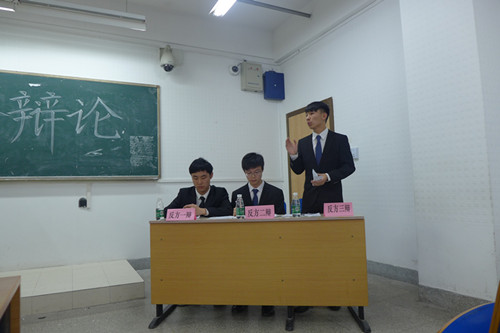 三位辩手面对对手抛出的问题回答起来不慌不忙,条理清晰,有理有据,并迅速抛出问题给对方。尤其是二辩李帅面对对手的咄咄逼人毫无畏惧之色,“快、准、狠”地一一回答并提问。最后由吴介总结陈词,气势逼人将交锋点清晰的阐述出来,场下再次响起雷鸣般的掌声。