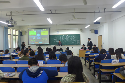 4月22日三点整,先锋辩论赛在教四楼B303教室激情上演。经过双方四十多分钟的唇枪舌战之后,最终由代表反方的黄色电影