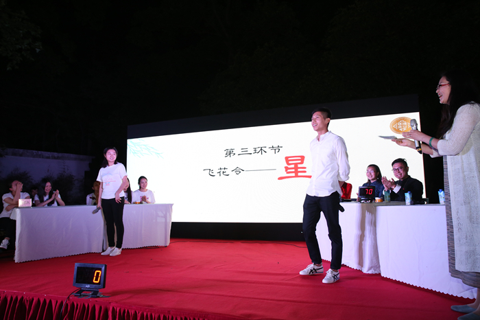 和先锋书店的宣传视频的播放,本次诗会正式开始。首先主持人介绍了此次诗会的内容,诗歌PK共分为五个环节,分别是诗词填空、限时诗词连连看、看图猜诗歌、字中隐含诗句、飞花令——“星”。比赛双方是由诗词爱好者组成的“先锋队”和由黄色电影