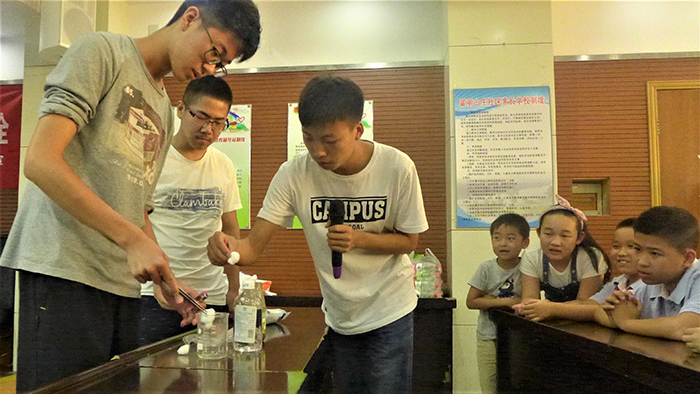 在化学知识科普之后,社会实践小组还为大家演示了化学与生活的小实验。小区的小学生们近距离观摩了实验过程,实验不仅增加了此次讲座的趣味性,更调动了小学生们的积极性,也更加深了他们对化学与生活知识的理解。在问答环节,现场的小朋友们举手抢答,积极互动,现场气氛活跃。