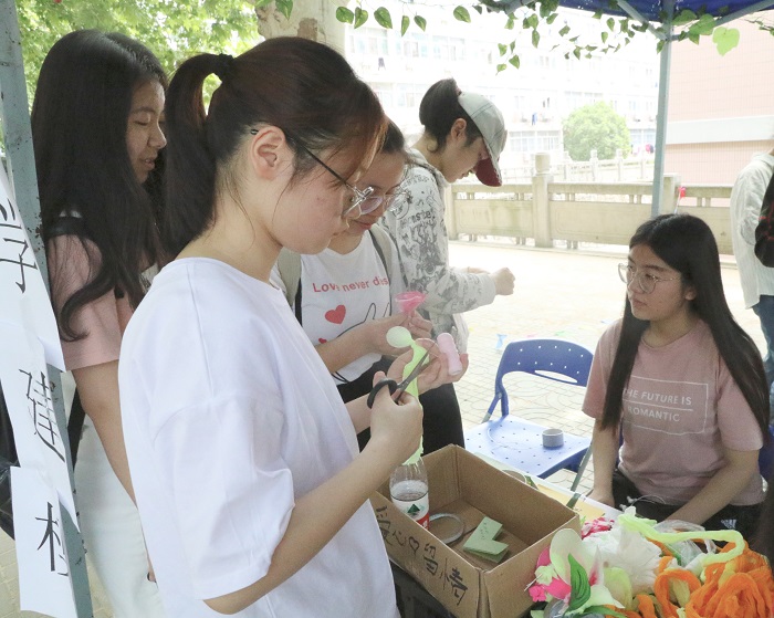 该活动吸引了不少的同学,同时还有几位阿姨与小朋友,他们积极参加做丝网花的活动,还有部分同学在自己叠好的爱心上用心写下了对母亲的祝福。