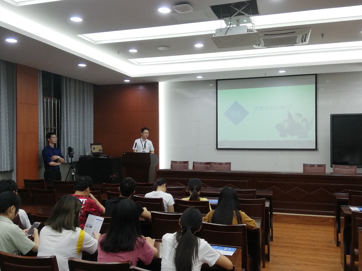 的校友,以师兄长以及职场人的双重身份,为毕业生分享了他们的成长经历。蒋晨博士在企业研发的分析部门工作,已经参与了某一创新药品的三期研发。当他介绍到自己在企业的种种科研生活时,理想照进现实的故事让在场的毕业生向往。陈耀忠博士在企业研发合成部工作,曲折的求职经历也让同学们备受感动和鼓舞。