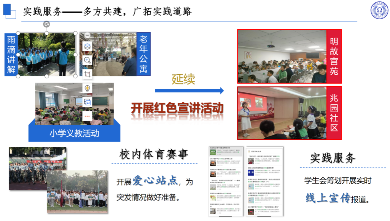学生会积极宣传本院同学先进志愿事迹、弘扬先锋青年。本年度在延续“小雨滴”志愿服务、美林老年公寓、小学义教的基础上,联合明故宫苑社区、兆园社区居委会开展红色文化宣讲活动。针对新生军训、运动会等校内体育赛事运动开展爱心站点,为突发情况做好准备。同时,学生会筹划开展实时线上宣传报导,展现新时代青年人敢于担当的责任感和爱国奉献的动人情怀,书写新时代青春答卷。
