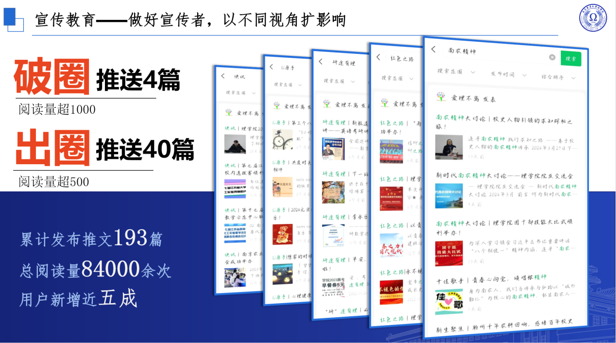 学生会在微信公众号“爱理不离”累积发布推文193篇,总阅读量84000余次。平台也在不断完善“Li原子”、“理院小管家”等模块,从同学们关心的学业、生活、情感、就业等方面问题入手,扩大影响。紧抓学风建设、思想引领方面,推出“不挂科”,“朋辈辅学”等全新系列板块;长期活动持续跟进,针对迎新季、毕业季等新闻集中期有条理、有规划、有准备地开展宣传工作,提高聚焦主体思想宣传的针对性和有效性。
