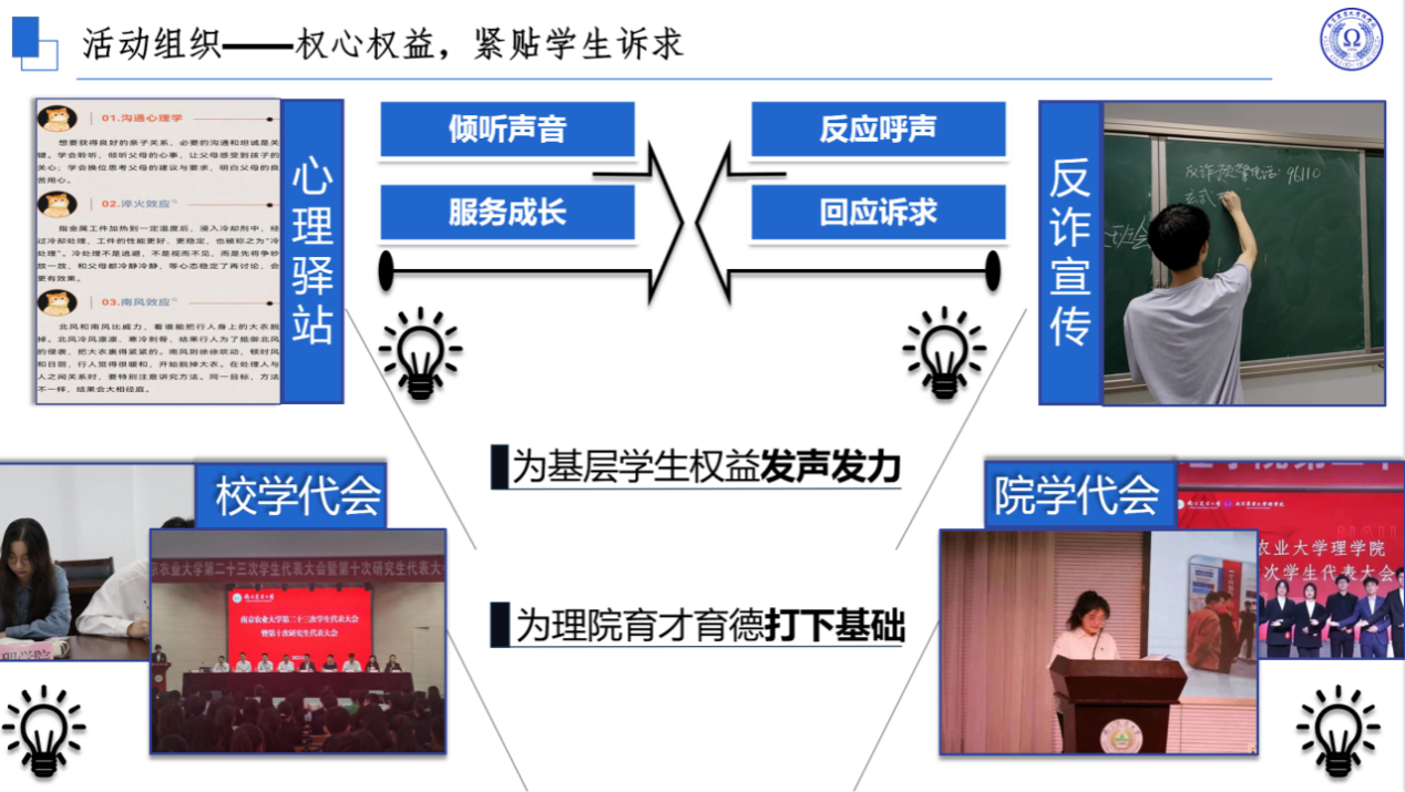 模拟政协提案大赛、全国青少年模拟政协提案征集活动、优秀宿舍评比等权益保障活动、急救知识培训等活动,长期开放这厢有“理”意见信箱,广泛开展心理状况调研,切实维护广大同学的切身利益和合法权益。