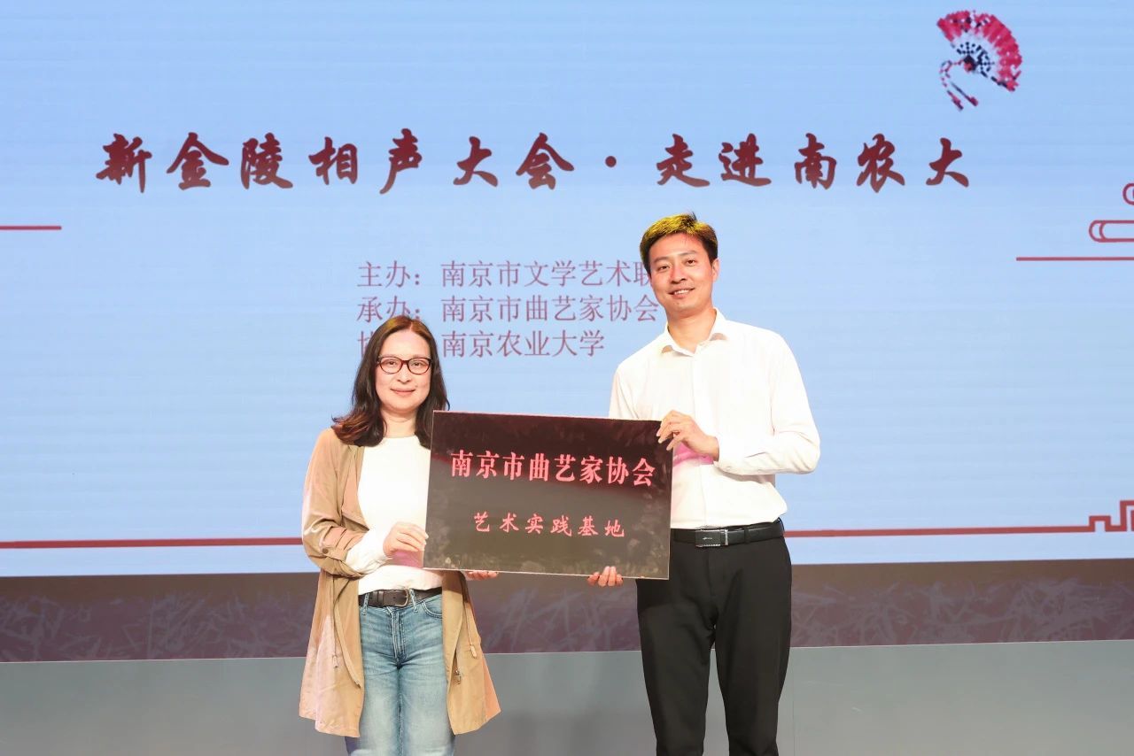 演出开始前,毛敏代表南京市文联向我校颁发了“南京市曲艺家协会艺术实践基地”铭牌。基地的设立,旨在通过相声等曲艺艺术,加强校地融合交流,丰富校园文化,让更多的青年了解、喜爱并传承中华优秀传统文化。