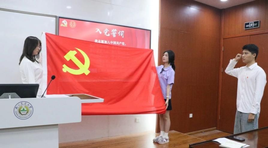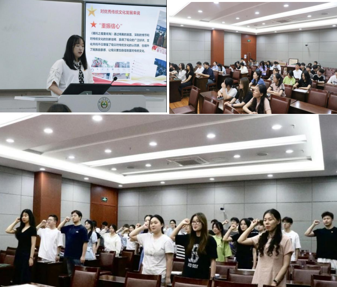 党课结束后,陈蔚昕、章慕、邓艺萱三位同学带领全体毕业生党员重温入党誓词。在庄严的誓言声中,同学们再次坚定了自己的理想信念和对党的忠诚。