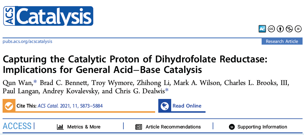 酸碱催化需要一个或多个质子参与,也是包括氧化还原酶和水解酶在内很多酶采用的催化策略。然而,直接观察反应中的质子穿梭非常困难。二氢叶酸还原酶采用酸碱催化将二氢叶酸还原为四氢叶酸,再参与到核酸的合成代谢中。抑制二氢叶酸还原酶就可以抑制核酸合成,并造成细胞的凋亡。因此,二氢叶酸还原酶可以作为抗微生物、抗癌、抗类风湿性关节炎的靶蛋白。本文采用中子衍射技术,发现单个质子从活性中心的水分子解离,并沿着一个狭长的通道将质子传递给二氢叶酸的N5原子,从而开启了催化反应。通过比较酸性和中性条件下的晶体结构,本文发现酶的动力学在酸性条件显著下降,尤其是活性调节区域Met20环,说明酶动力学在水分子进入活性中子参与催化反应中扮演了重要角色。本课题得到了国家自然科学基金面上项目(NSFC32071264)的支持。