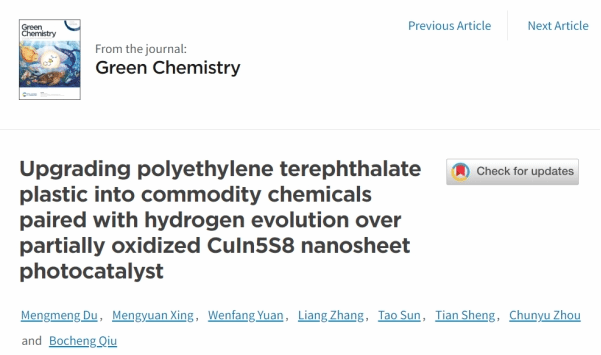 邱博诚教授团队在国际著名学术期刊Green Chemistry上在线发表了题“Upgrading polyethylene terephthalate plastic into commodity chemicals paired with hydrogen evolution over partially oxidized CuIn5S8 nanosheet photocatalyst”的最新研究成果。