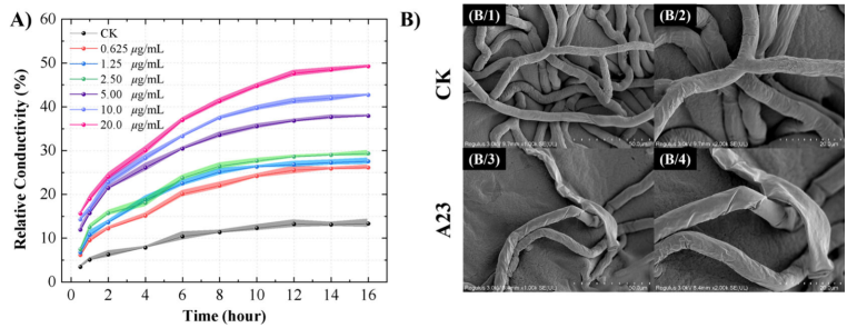 为进一步揭示其作用机制,研究团队开展了细胞膜通透性测试、扫描电镜(SEM)与分子荧光免疫实验。化合物A23导致灰霉病菌菌丝异常扭曲、表面褶皱,并通过破坏细胞膜完整性导致电导率升高。分子荧光免疫测定显示,化合物A23可以抑制微管蛋白聚合,提示其作用机制可能涉及破坏微管蛋白的结构功能。