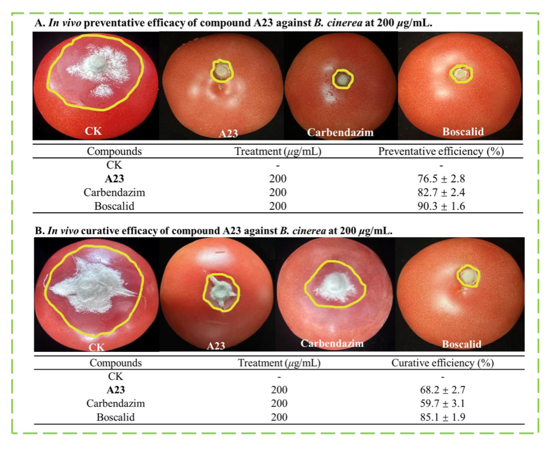 本研究通过在3-羟基黄酮结构上引入苯并咪唑和砜基/羰对灰基基团,构建了一系列共30余种目标化合物。初步离体活性结果表明,大多数目标化合物霉病菌表现出良好的抗菌活性。化合物A23对灰霉病菌EC50值为0.338 μg/mL,优于商品药多菌灵(0.625 μg/mL)。活体实验表明,在200 μg/mL浓度下化合物A23对灰霉病的保护效果可以达到76.5%,治疗效果可以达到68.2%,显示出良好的开发应用潜力。
