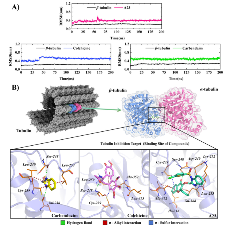 通过分子动力学模拟与分子对接进一步分析了活性小分子配体与靶标之间的动态稳定过程。化合物A23与微管蛋白结合稳定,结合能(−41.8 kcal/mol)低于商品药多菌灵(−25.7 kcal/mol)。化合物A23与微管蛋白活性口袋内关键残基形成稳定的氢键,π-硫和π-烷基相互作用,且分子占据与多菌灵相似的结合位点,验证了其作为微管蛋白抑制剂类杀菌剂的潜力。